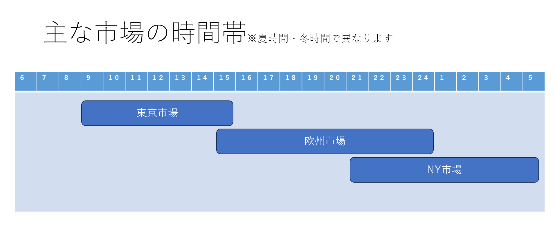 それでその市場にどうやって参加すればいいの?いつやってんの!?てことなんですが、各市場で時間帯が決まっていてその時間内で取引することで参加でき、時間帯もある程度決まってます♪