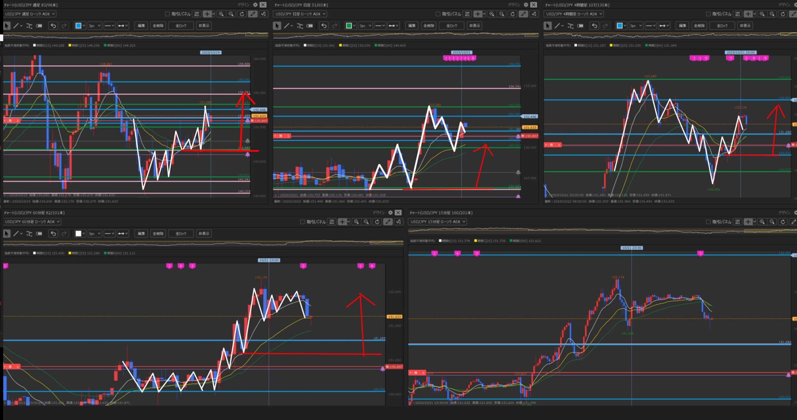 ここからは前回高値、起点の反応を見て下位足が転換するようであれば追加ロット入れていく感じで見ていきます(・ω・)