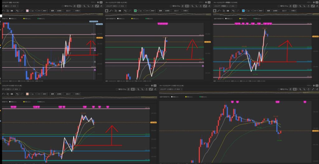 昨日の指標云々が終わってから日足で再度高値を更新した状態。そして週足の一旦意識されそうなラインまでは到達して少し下げてきているかなーという状態ですね~。