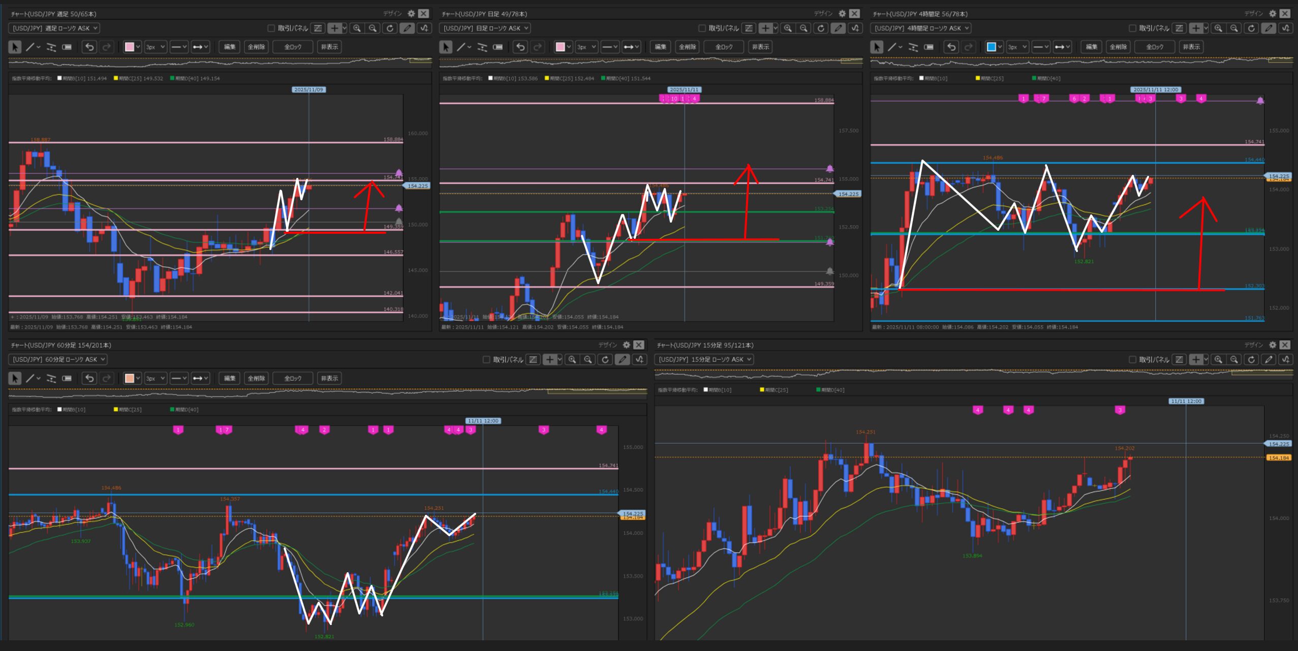 4時間足 下降転換シグナルが出た後の上昇トレンド。再度高値を更新できるか試しているような状況ですね(・ω・)