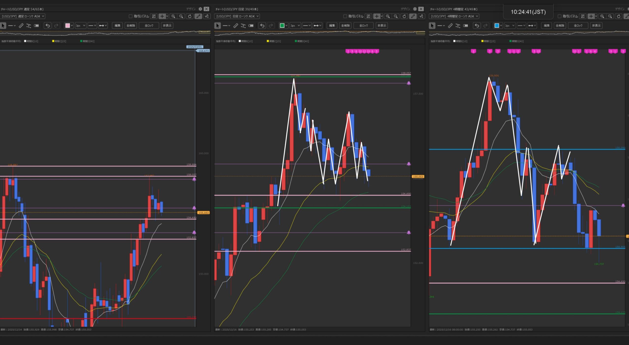 4時間足の意識されそうな水平線水色に当たった後、1時間足で安値を切り上げていたところ高値を切り上げられず安値が切り下がったのを確認。