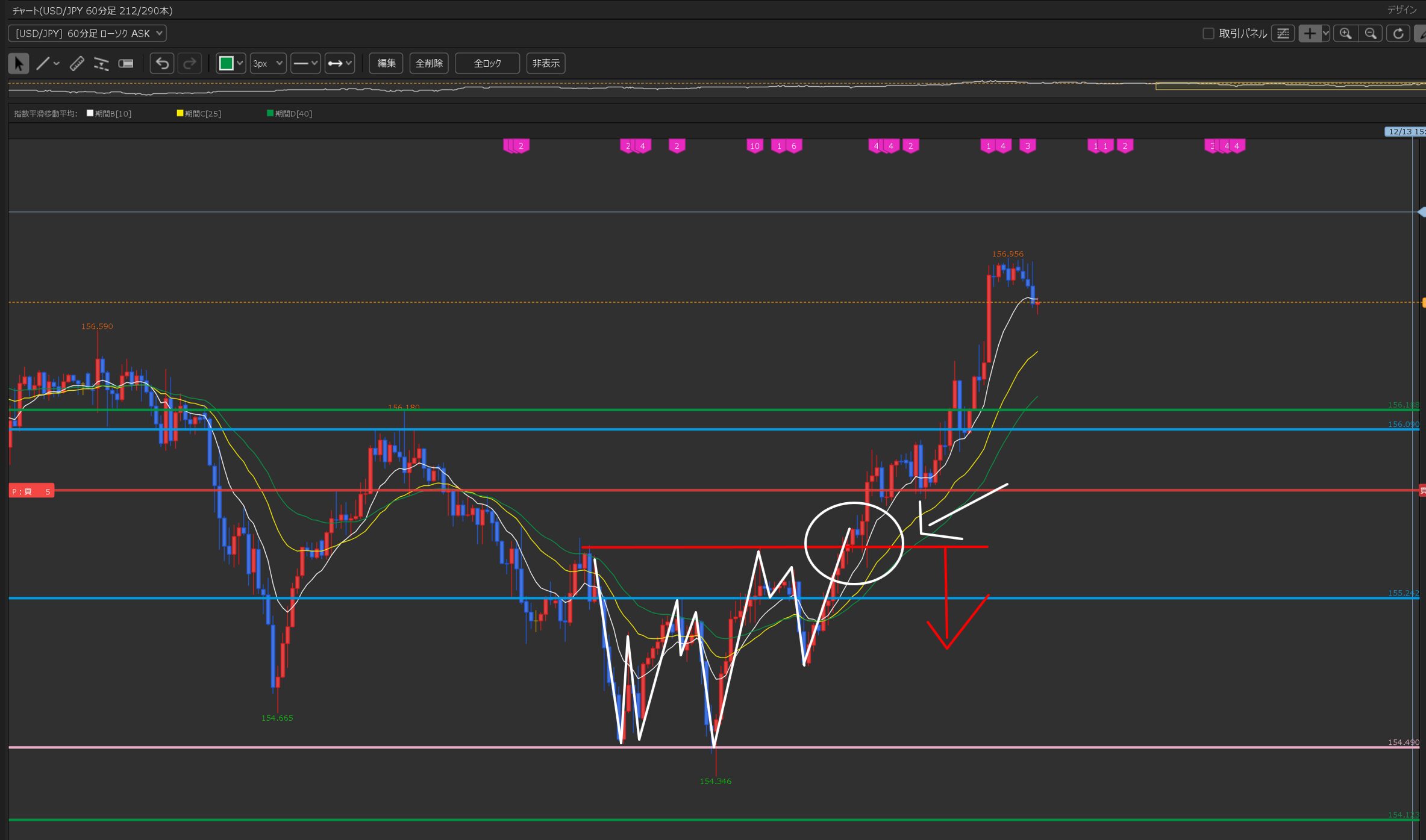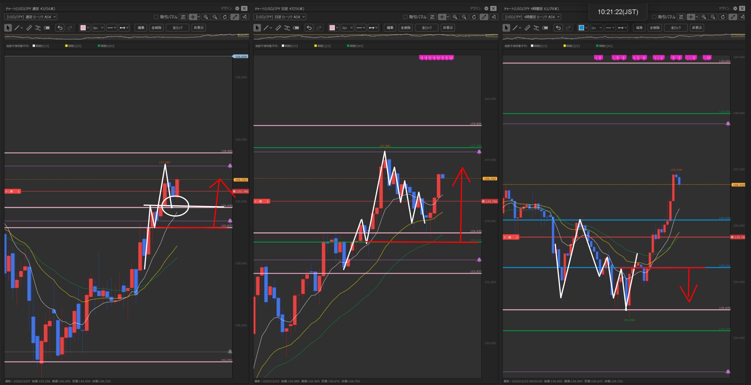 - 4時間足 赤矢印下目線を上にブレイクし上目線へ転換