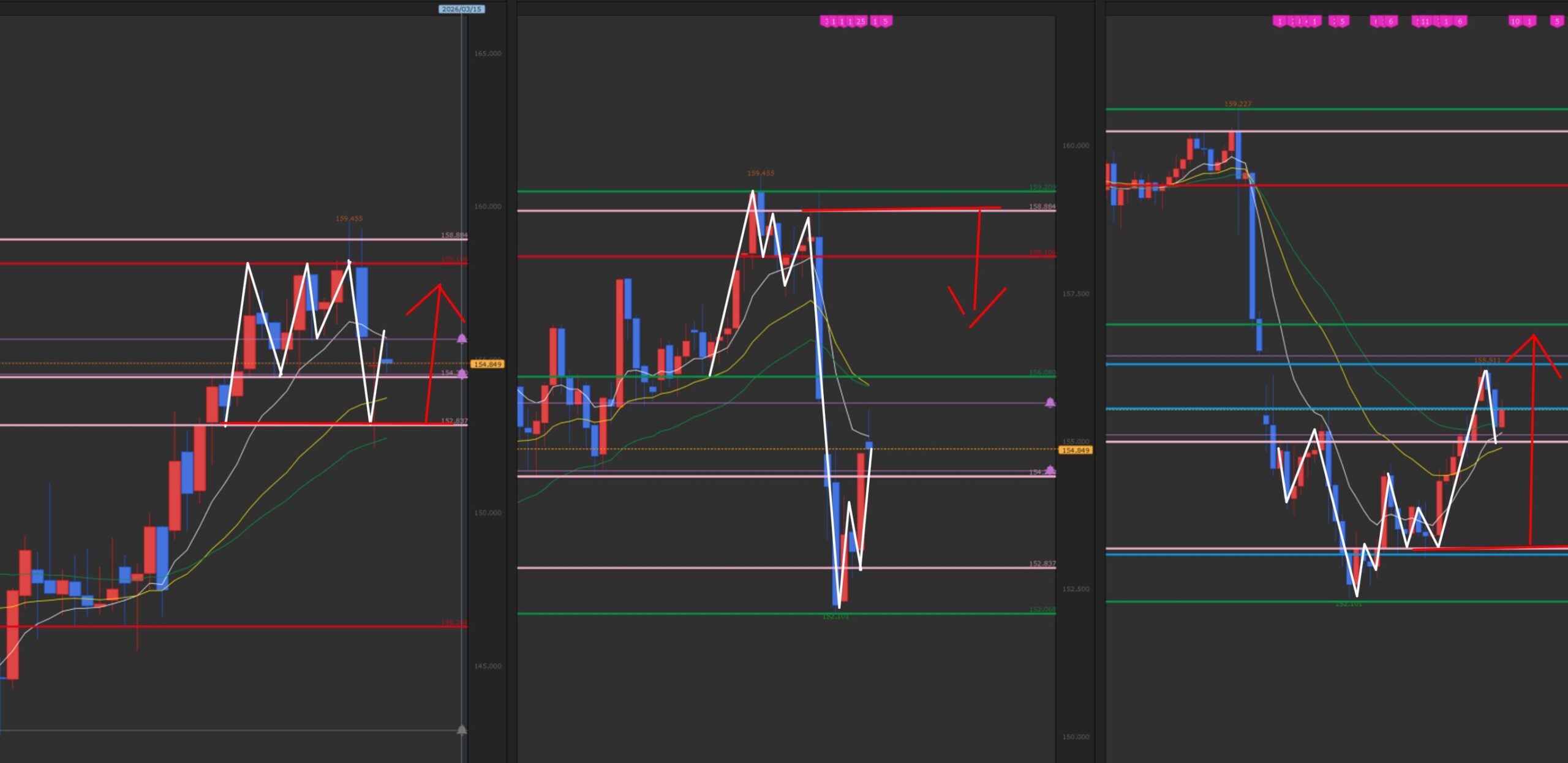 週足と日足で方向感がアンマッチなのでやりづらい展開が続きそうです。加えて日足は目線下、4時間足は目線上なので更にやりにくい状況ですね。