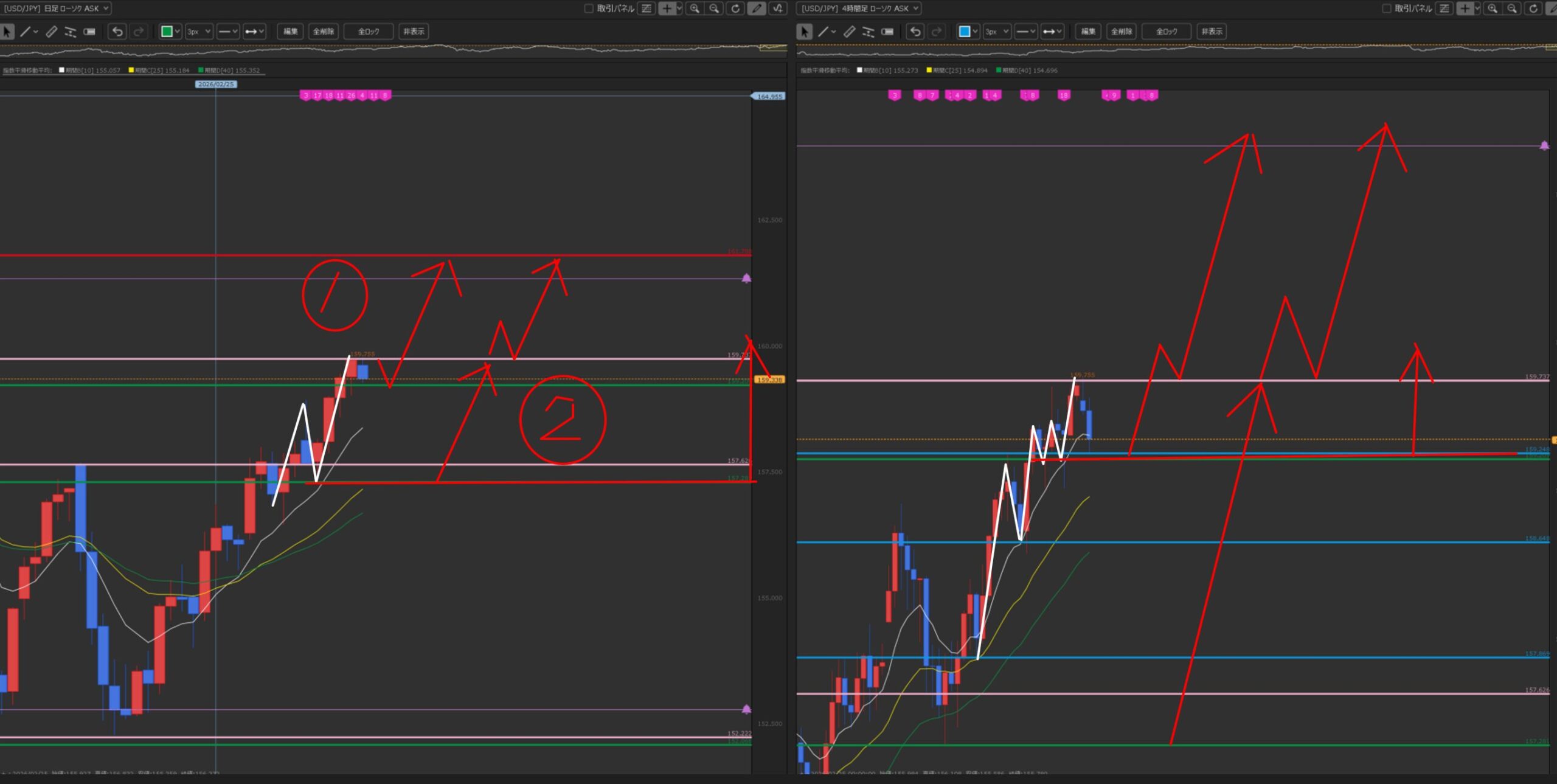 日足レベルの最安値まで戻った後に4時間足で転換してくれば日足最高値までを狙う。超えていくようなら次の月足までを取って行く。