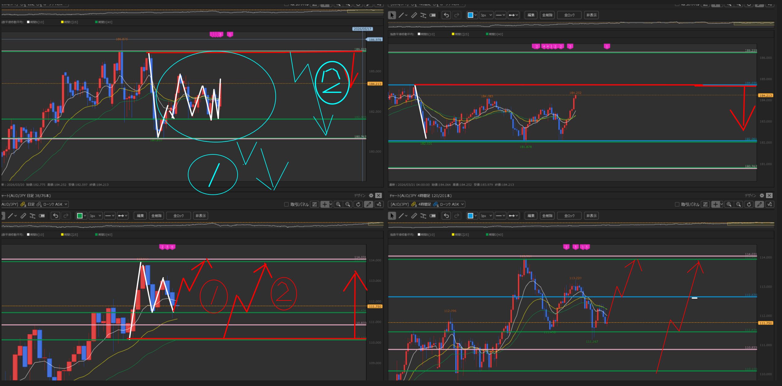 日足 上目線・4時間足 目線微妙(上とも下とも見れる)