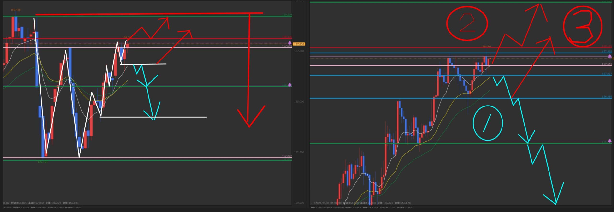 ショート目線で考えつつ4時間足が上に転換してくるようなら日足の下目線の起点までをロングで取りに行く。