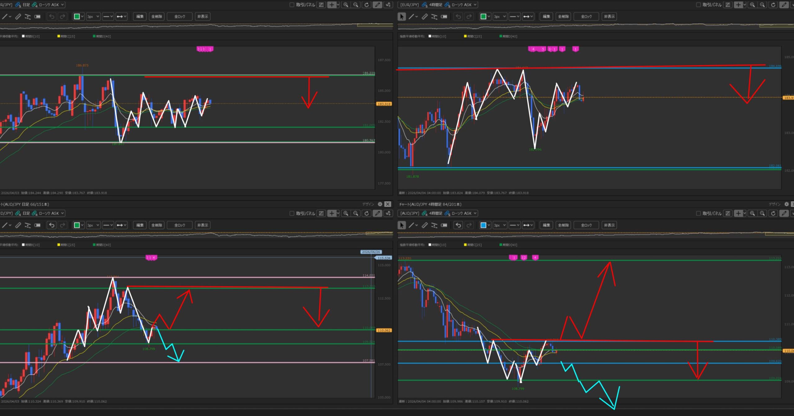 日足が一応下目線になったものの、ゾーンで考えれば反発し始めた・・・のか?という感じなので4時間足の様子を見て行きたい所。