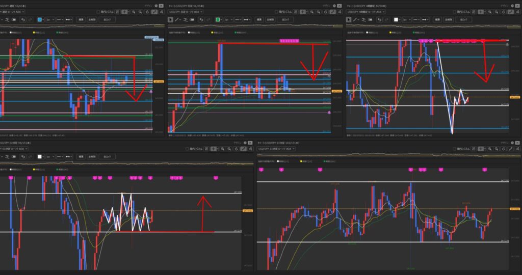 白い水平線の間でレンジ展開になっていますね~。1時間足の確定次第で上を狙うか下を狙うか判断していきたいところですが、今日は重要指標がいくつか重なるので長期保有は避けたいところですね。