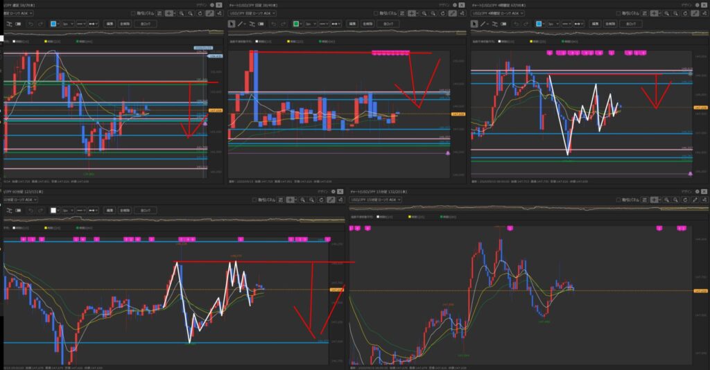 1時間足、上昇トレンドが出て1時間足最安値の起点にタッチ後、下降トレンドが発生している状態。
