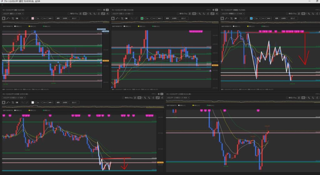 ただ1時間足の直近最安値の起点がちょっと微妙かなーという感じ、僕と同じように見てるか、もしくは4時間足と同じ波形で見ているか・・・といった感じですね~。