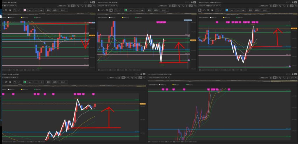 前回の環境認識から1時間足が上昇トレンドに転換し、抑えられていた水平線がサポートになり一気に上昇といった感じですね~。指標や要人発言もあるしスルーしてましたが良い上昇でしたね~